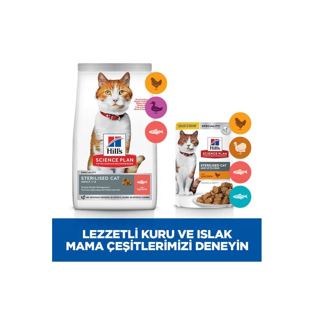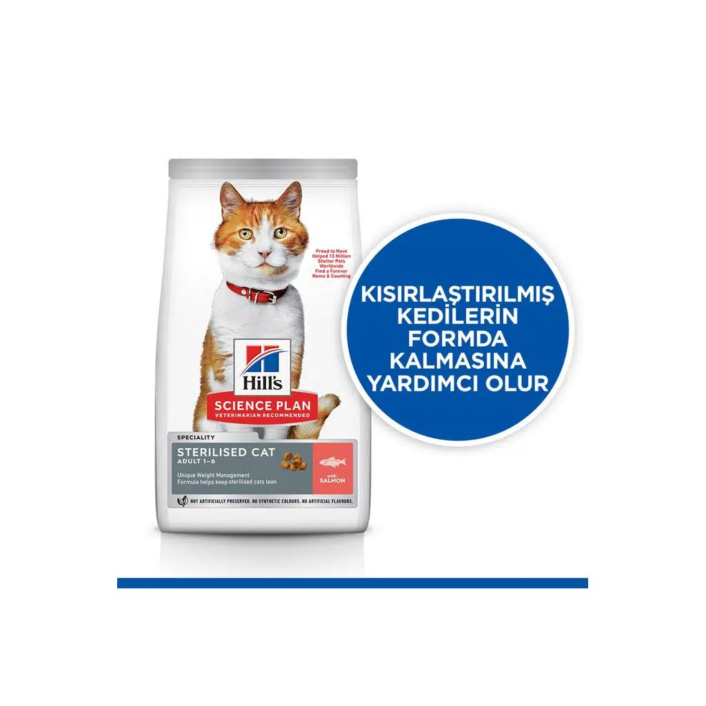 Hill's SCIENCE PLAN SOMONLU KISIRLAŞTIRILMIŞ YETİŞKİN KEDİ MAMASI, 1 ila 6 yaş arası kısırlaştırılmış yetişkin kediler için eksiksiz bir evcil hayvan mamasıdır.
