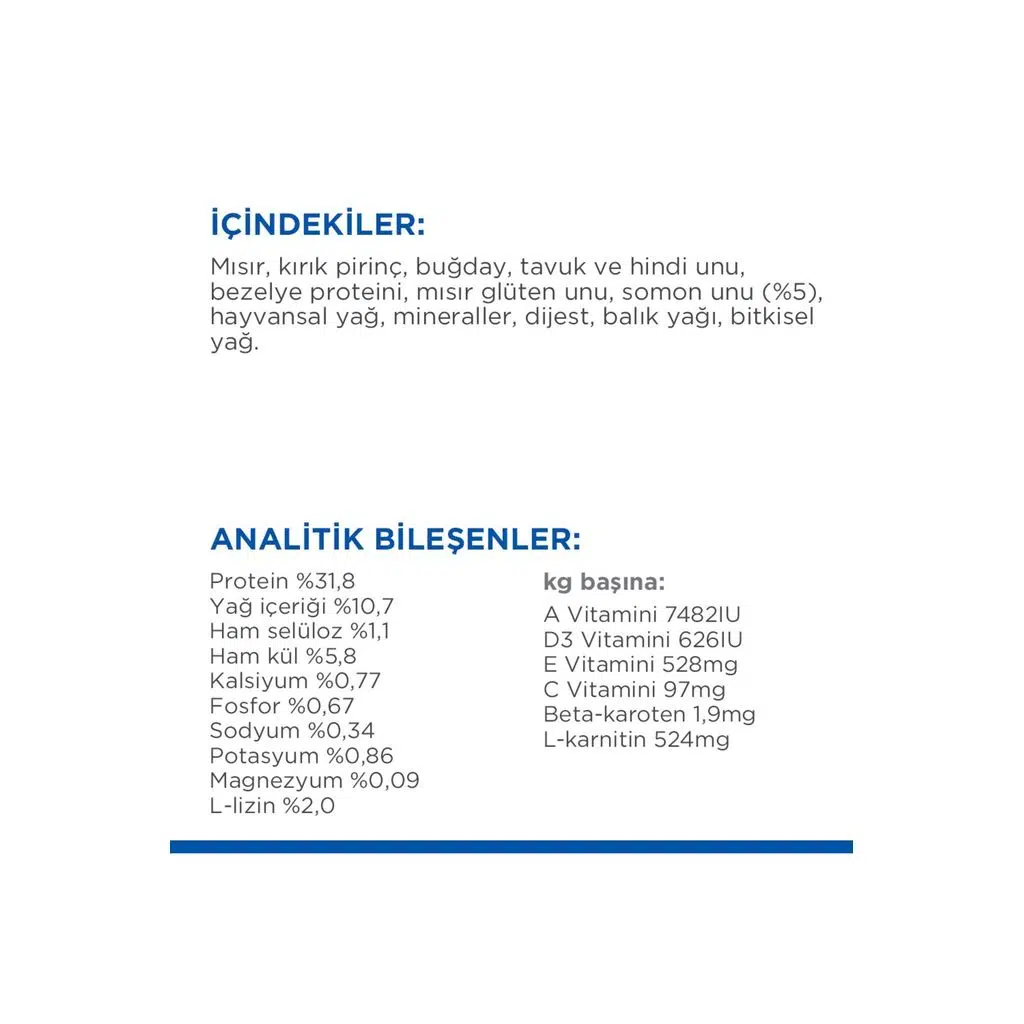 Mısır - Kırık Pirinç - Buğday - Tavuk ve Hindi Unu - Bezelye Proteini - Mısır Gluten Unu - Somon Unu - Hayvansal Yağ - Mineraller - Balık Yağı - Bitkisel Yağ